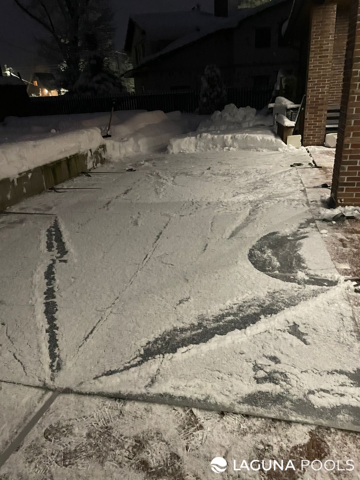 Внутренний двор с оборудованием для бассейна и заснеженной плиткой ночью